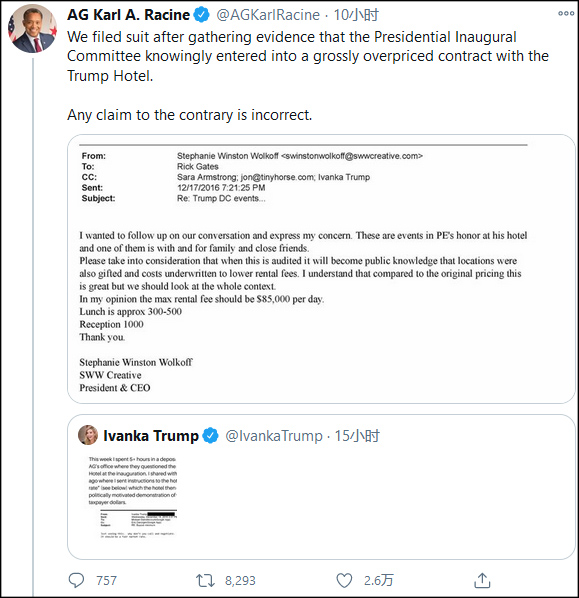 拉辛很快也在推特上對伊萬卡的批評作出回應,他展示了沃爾科夫2016年12月17日給蓋茨的一封郵件。沃爾科夫在這封郵件中稱,她估算下來實際上每天的場地租金最高應該也只有8.5萬美元,這比委員會列舉的每日場地費用開銷要低了9萬美元。