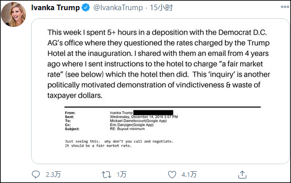 伊萬卡宣稱,她向調查人員出示了四年前的一封電子郵件,她在這封郵件中要求酒店按照正常的市場價格收取費用,酒店也照她的話做了。伊萬卡在這條推文中附上了相關電子郵件的截圖。