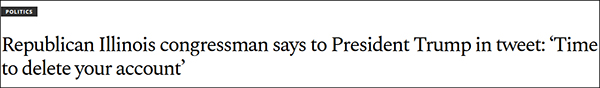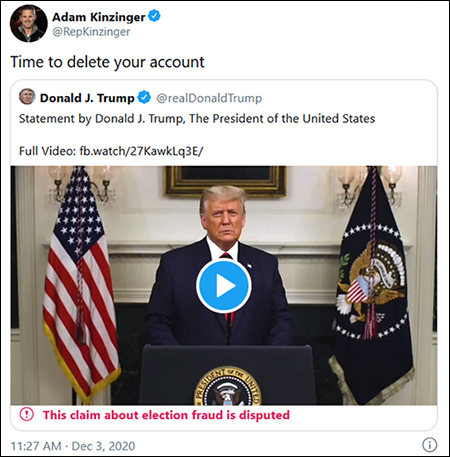 據《芝加哥論壇報》3日報道,在特朗普這段視頻發佈幾小時後,來自伊利諾伊州的美國國會共和黨眾議員亞當·金辛格(Adam Kinzinger)在推特上嘲諷特朗普,建議他刪掉推特賬號。