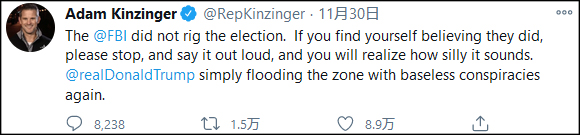 金辛格已多次在推特上斥責特朗普的做法。11月30日,他就曾公開和特朗普“唱反調”:“聯邦調查局沒有操縱選舉。如果你還是覺得他們這麼幹了,那就停一下再大聲重複一遍,然後你就會發現這有多蠢。特朗普只是在讓毫無根據的陰謀論翻再度氾濫。”