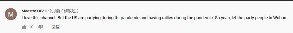 還有一條評論稱:“我喜歡這個頻道,但美國在整個疫情期間都在開派對,舉行集會。所以,讓武漢的人們開派對吧。”