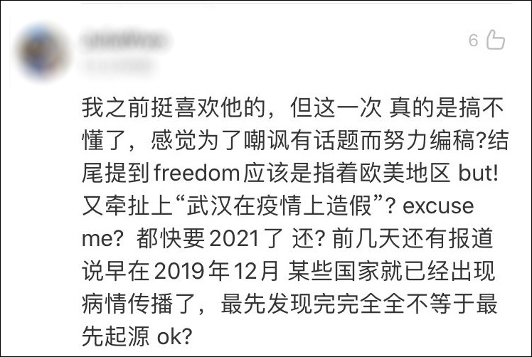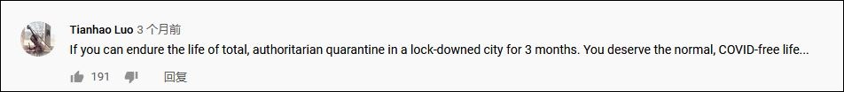 當然,崔娃的這番言論也招致不少批評。當期節目在YouTube平台下點贊最高的一條評論就表示:“如果你能夠在一座封鎖的城市裏,忍受完全、威權般的隔離生活3個月,你值得享受正常,沒有新冠疫情的生活……”