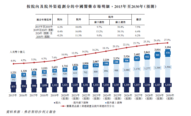 據弗若斯特沙利文報告,2019年中國數字健康市場規模為2180億元,預計2024年可增至11290億元,同時醫藥產品線上渠道銷量佔院外渠道的比例已從2015年的5%升至10.9%,預計在2030年達到27.5%。