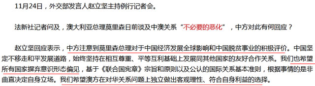 最後我和他説,其實中方應該是注意到這個信號的,但是按照我們的慣例,外交部肯定説我們注意到了什麼什麼,我們期望如何如何,澳大利亞能夠怎麼怎麼樣,把中澳關係拉回正軌。