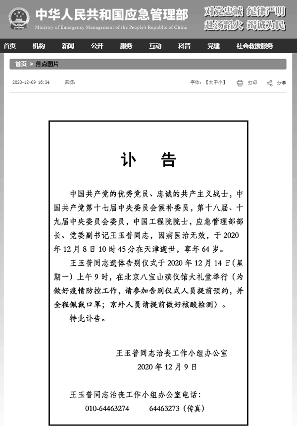 中國共產黨的優秀黨員、忠誠的共產主義戰士,中國共產黨第十七屆中央委員會候補委員,第十八屆、十九屆中央委員會委員,中國工程院院士,應急管理部部長、黨委副書記王玉普同志,因病醫治無效,於2020年12月8日10時45分在天津逝世,享年64歲。