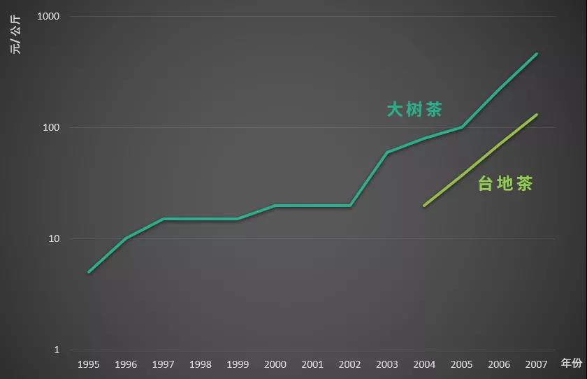 從這個圖表上也可以看到,在很長的一段時間裏,古樹茶和台地茶的價格是沒有差別的,甚至當地人其實更鐘情於台地茶。但是大概從2004年開始,兩者的價格出現了巨大的反差,大樹茶的價格變得越來越高,台地茶就永遠都趕不上大樹茶。為什麼會出現這樣的變化呢?