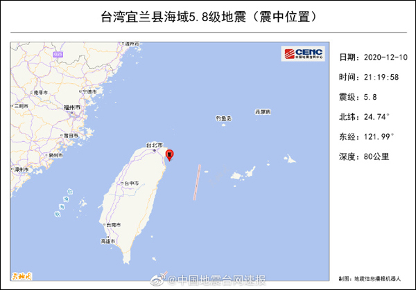 @中國地震台網 消息,中國地震台網正式測定:12月10日21時19分在台灣宜蘭縣海域(北緯24.74度,東經121.99度)發生5.8級地震,震源深度80千米。