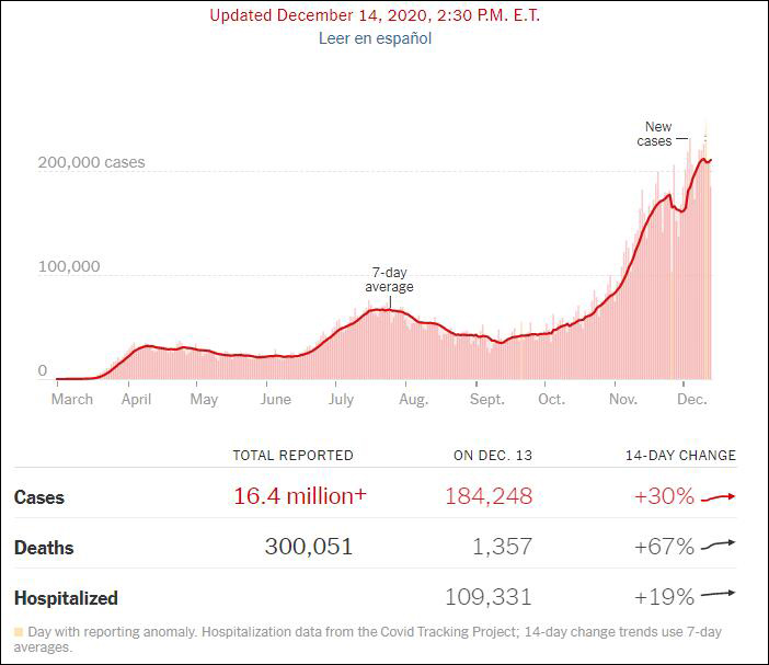 《紐約時報》14日更新的疫情數據顯示,美國累計確診新冠肺炎病例超1640萬例,累計死亡病例突破30萬例。