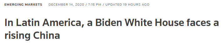 (觀察者網訊)拉丁美洲地區長期被美國視為“後花園”。當地時間12月14日,路透社刊發文章,題為《在拉美,即將入主白宮的拜登面臨着崛起的中國》。