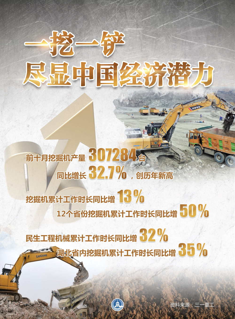 國家統計局最新數據顯示,10月份,我國挖掘機產量35098台,同比增長42.4%;前十月挖掘機產量307284台,同比增長32.7%,創歷年新高。