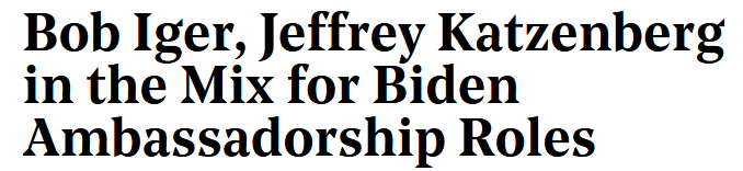 有消息人士説,長期民主黨捐助者、知名電影製片人卡森伯格(Jeffrey Katzenberg)也將會在拜登政府中的擔任駐外大使。