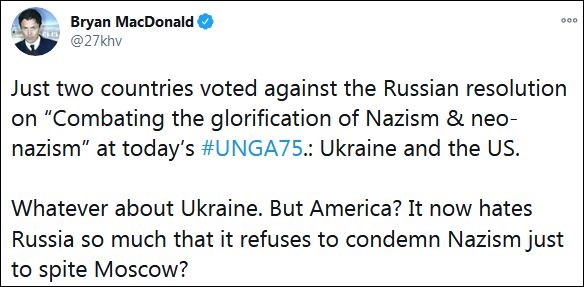 針對本次投票,麥克唐納德在推特上評論稱:“烏克蘭隨便怎麼樣,但美國也投下反對票?它現在如此憎恨俄羅斯,以至於它拒絕譴責納粹主義,只是為了刁難莫斯科。”