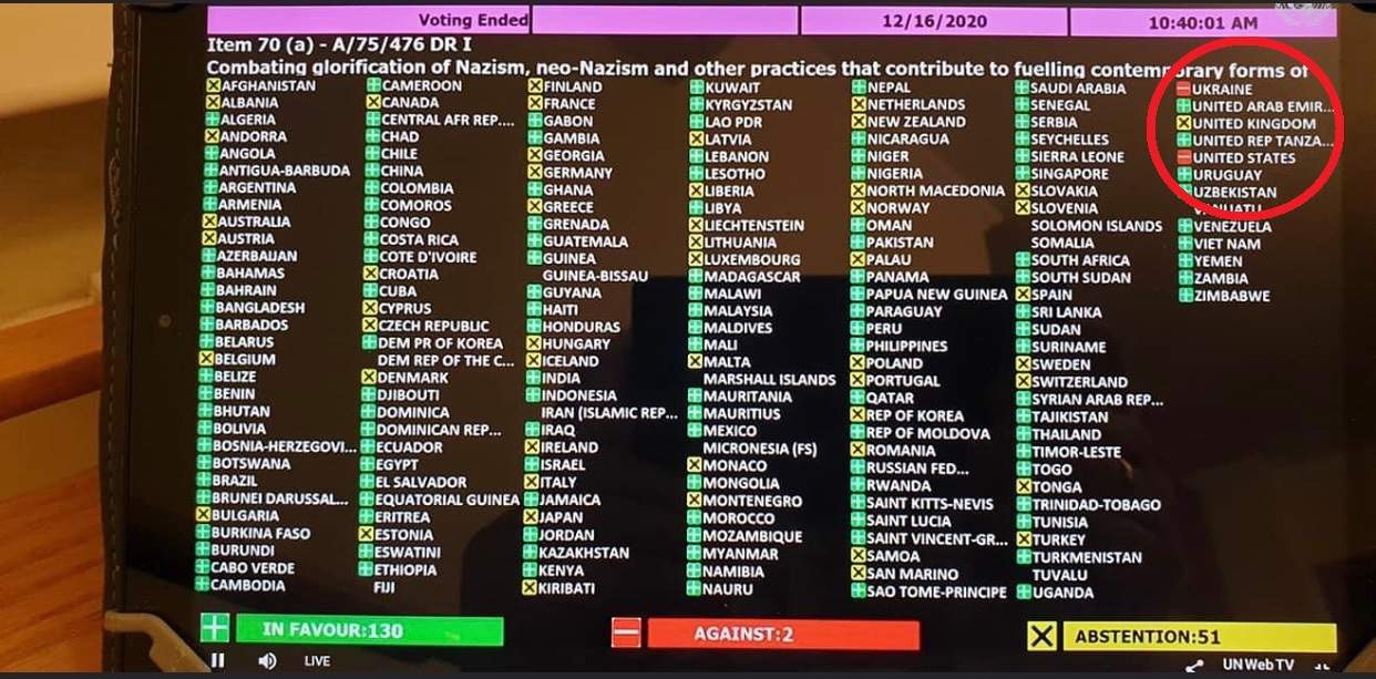 大會首先進行記錄表決,最終成員國以130票贊成,2票反對(美國和烏克蘭)以及51票棄權,通過了這項名為《“打擊美化納粹主義、新納粹主義和助長當代形式種族主義、種族歧視、仇外心理及有關不容忍的其他做法》決議草案一。