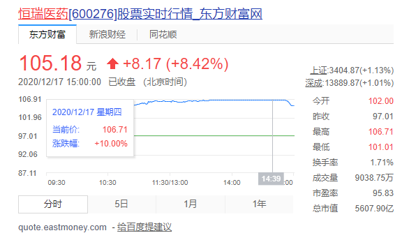 12月16日,為期3天的2020年國家醫保目錄藥品談判結束,明星抗癌藥PD-1/PD-L1抑制劑的談判結果備受關注,醫保局尚未官宣結果,但PD-1生產藥企恆瑞醫藥股價17日一度大漲10%,封上漲停板,報106.71元,創歷史新高。截至發稿,股價為105.18元,市值5172.83億元。