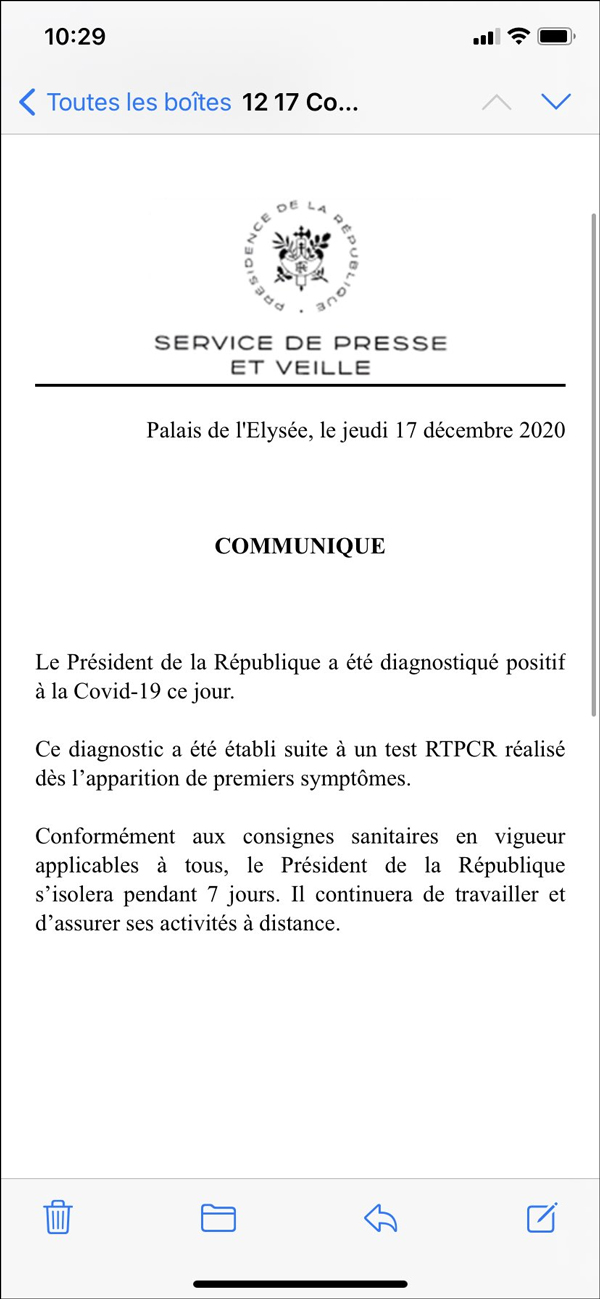 據法國總統府愛麗捨宮發佈的公告,馬克龍是因為出現了初步的症狀而接受檢測的。根據相關的防控規定,馬克龍將開始進行7天隔離,他將繼續以遠程的方式開展工作及相關活動。此後,法國總理卡斯泰作為密切接觸者開始自我隔離,並等待檢測結果。