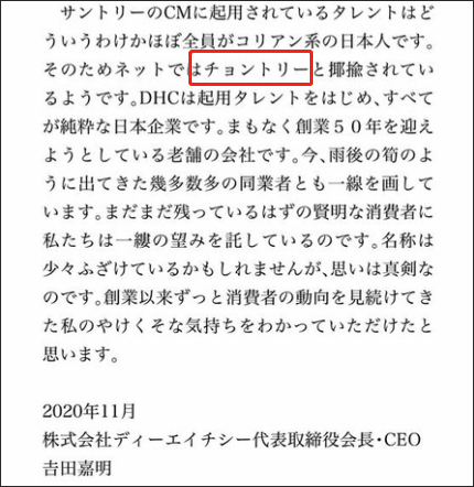 這篇文章本來是吹噓其保健產品功能,但突然提到了其競爭對手三得利(Suntory),吉田寫道“三得利啓用的廣告藝人基本上都是韓裔日本人,正因如此,才會被網友稱為‘Chontory’(チョントリー)”。