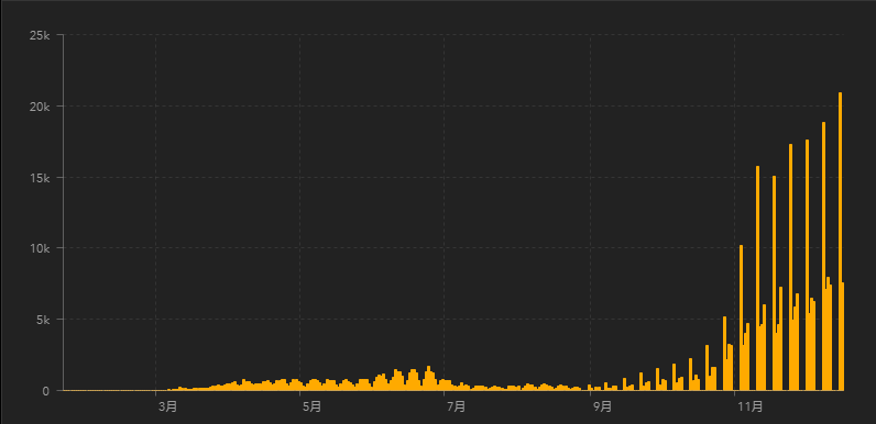 11月前後開始,瑞典單日新增確診病例數量不斷突破記錄 截圖:約翰·霍普金斯大學