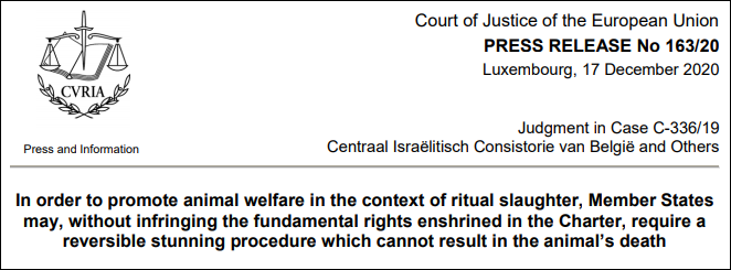 在歐洲法院官網所發佈的裁決文件中寫道:“法院的結論是,該命令中所包含的措施,能夠使人們在重視動物福利和猶太教及穆斯林信徒表達其‘宗教信仰自由’之間達成一種平衡。”