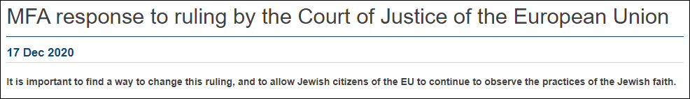 “這向所有歐洲猶太人發出了嚴酷的信號。”以色列外交部在一份聲明中表示,歐洲法院的裁定不僅損害了“宗教信仰自由”這一歐盟的核心價值觀,還向猶太人羣體發出信號,即猶太人的生活方式在歐洲是不受歡迎的。