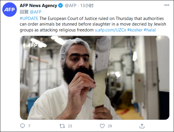 法新社報道稱,歐洲法院的這一裁定實際上是基於動物保護權作出的,同時也支持了比利時法蘭德斯地區(Flanders)政府數年前實施的牲畜未經致昏禁止屠宰的法令。