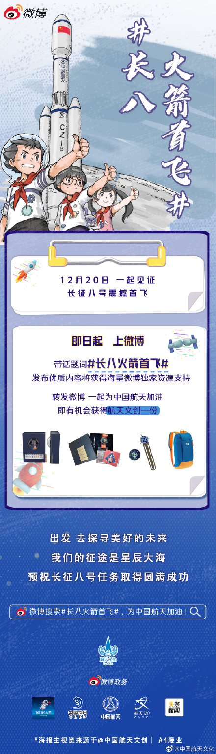 (觀察者網訊)國家航天局新聞中心直屬文化平台微博(@中國航天文化 )12月18日發佈消息,長征八號將於12月20日進行首飛。