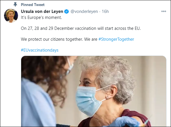 當地時間12月17日,歐盟委員會主席烏爾蘇拉·馮德萊恩(Ursula von der Leyen)通過社交媒體宣佈,歐盟定於本月底啓動新冠疫苗接種。馮德萊恩在推特上寫道:“這是歐洲的時刻。12月27日、28日和29日,整個歐盟將開始接種疫苗。”