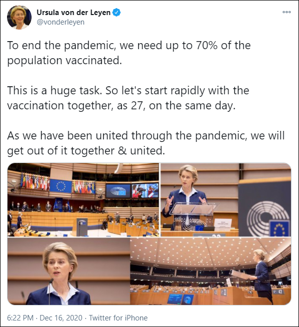馮德萊恩12月16日的推文似乎證實了這一計劃。她在推特上寫道:“為結束新冠疫情,歐盟地區70%人口需要接種疫苗。這是一項艱鉅的任務。所以讓我們一起儘快接種疫苗,27個成員國,從同一天開始。”