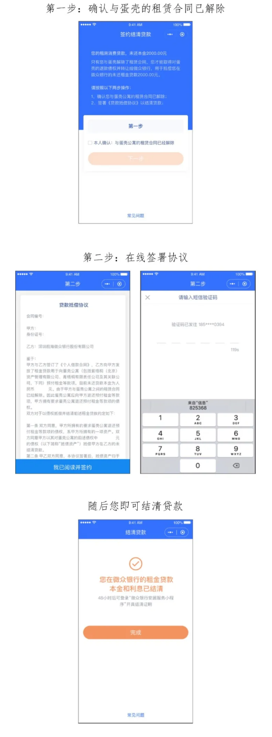 2020年12月4日,我行發佈公告,蛋殼租金貸客户退租後,無需還款也可結清貸款。現將具體操作指引公告如下: