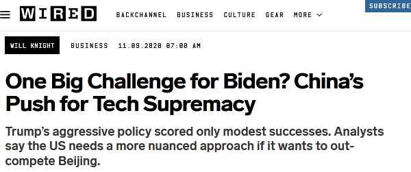 美國《連線》雜誌網站2020年11月9日刊發了記者威爾·奈特的報道《拜登面臨重大挑戰?中國為取得科技霸權展開攻勢》