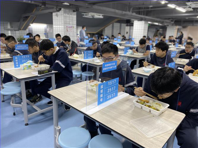 除此以外,學生上學進校門需要洗手,學校為此購置了多台手消設備,還在校門口安置了紅外線測温儀檢測每一位入校師生的體温。除了師生以外,其他外來人員一律謝絕入內,所有可能造成人羣聚集的活動,包括全區的教研活動,能轉線上的轉為線上,不能線上舉行的就只能取消了。所有教室每天都要定時開窗通風,不論寒暑,放學後還會有保潔人員負責噴灑消毒藥水。學生上學放學需要錯峯,為此不同年級上課的時間都要錯開。中午吃飯也是如此,所有座位之間用透明玻璃板隔開,兩人不能面對面坐,也沒有交流的時間——吃完你得趕緊走,不然第二波錯峯就餐的同學可就沒座位了。