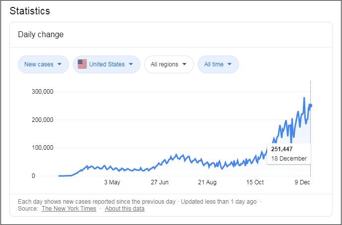 經歷了春天的新冠疫情,紐約州一度在今年夏季迴歸正常。但進入11月,紐約州又經歷了一次病例反彈,12月4日的新增病例數達到了11274例,12月18日的新增病例數再創歷史紀錄,達到了12606例。