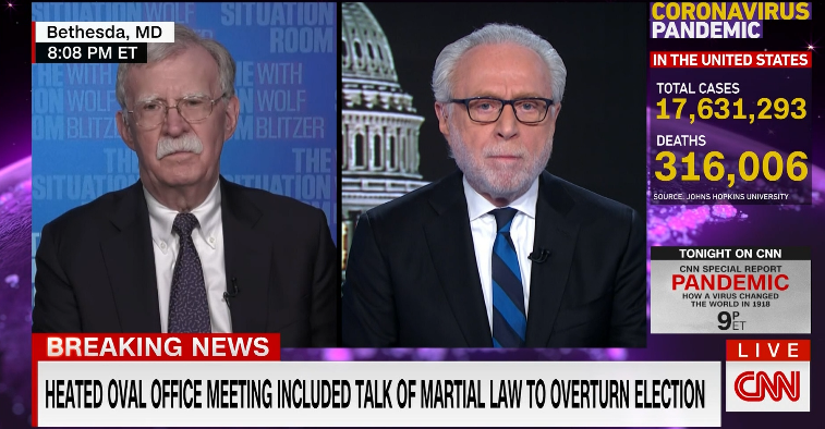據國會山報(The Hill)報道,特朗普這次之所以把火力對準博爾頓,是因為12月19日美國有線電視新聞網(CNN)的一場採訪。採訪中,博爾頓和主持人談到了此前媒體關於特朗普考慮“戒嚴令”的爆料。博爾頓稱這件事情“駭人聽聞”,還表示“同樣的行為反覆出現。讓我們考慮一下在搖擺州里部署軍隊並再次競選的想法。聽着,無能和惡意是有區別的。在特朗普這件事上,這是無能。”