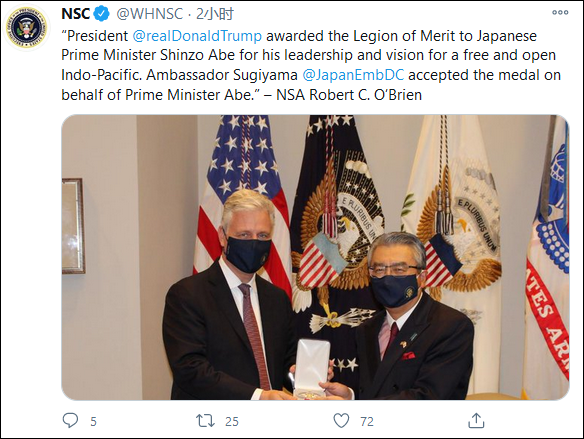 在NSC官推上,首先發出了一條帶有勳章實物圖和頒發勳章現場合照的圖文。圖中,日本駐美國大使杉山晉輔、印度駐美國大使塔蘭吉特·辛格·桑杜(Taranjit Singh Sandhu)和澳大利亞駐美國大使阿瑟·西諾迪諾斯(Arthur Sinodinos)分別代表安倍晉三、莫迪和莫里森領取了“功績勳章”,並與白宮國家安全顧問奧布萊恩合影留念。