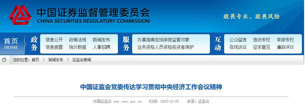 證監會網站12月22日消息,中央經濟工作會議勝利閉幕後,證監會黨委當日下午即召開專題會議,研究學習貫徹會議精神的初步安排。12月22日,黨委書記、主席易會滿主持召開黨委會和黨委(擴大)會,傳達學習會議精神,要求全系統認真學習、深入貫徹中央經濟工作會議精神,把黨中央決策部署轉化為創造性抓落實的務實舉措,努力在更高起點上開創資本市場服務經濟社會高質量發展的新局面。