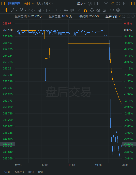 阿里巴巴美股盤後跳水,截至美東時間23日20點(北京時間24日9點),下跌3.42%盤後價報247.42美元,美股收盤價256.18美元。