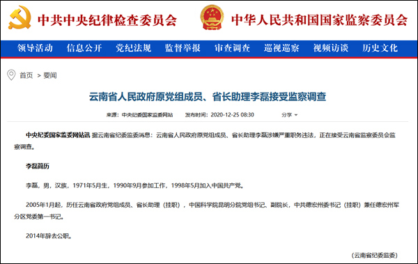 據中央紀委國家監委網站12月25日消息,據雲南省紀委監委消息:雲南省人民政府原黨組成員、省長助理李磊涉嫌嚴重職務違法,正在接受雲南省監察委員會監察調查。