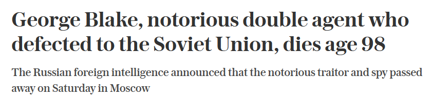 (觀察者網訊)“我們收到了一個悲痛的消息——傳奇人物喬治·布雷克(George Blake)去世了。”當地時間12月26日,路透社、《每日電訊報》消息稱,俄羅斯對外情報局發言人謝爾蓋·伊萬諾夫(Sergei Ivanov)宣佈,冷戰時期著名英國雙面間諜喬治·布萊克(George Blake)26日在俄羅斯去世,終年98歲。