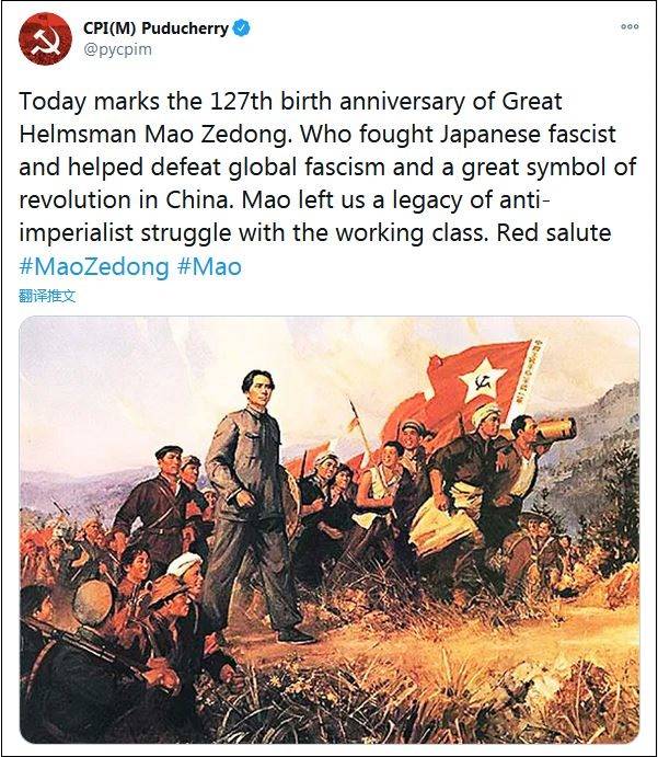 昨天(12月26日),是毛澤東誕辰127週年紀念日。印度東南部本地治裏(Puducherry)地區的共產黨(馬克思主義)在官方推特上引用毛澤東名言的同時,還向他致以“紅色敬禮”。隨後,這條推特還獲得中國外交部發言人趙立堅的轉發。