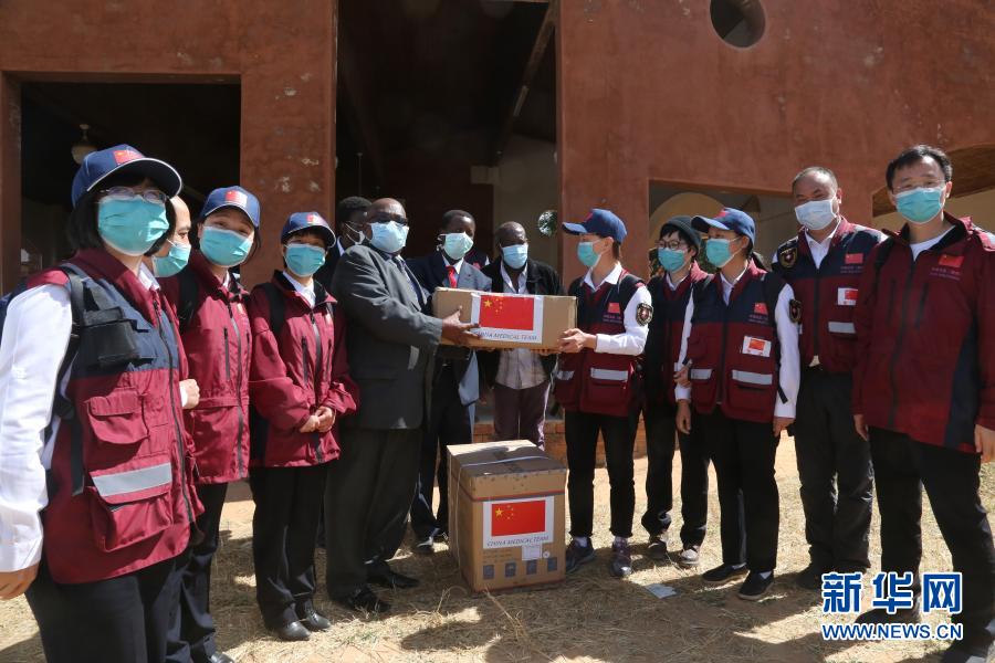 5月19日,在津巴布韋中馬紹納蘭省的姆武爾維醫院,中國抗疫醫療專家組為當地醫療機構捐贈醫療物資。新華社記者 張玉亮 攝