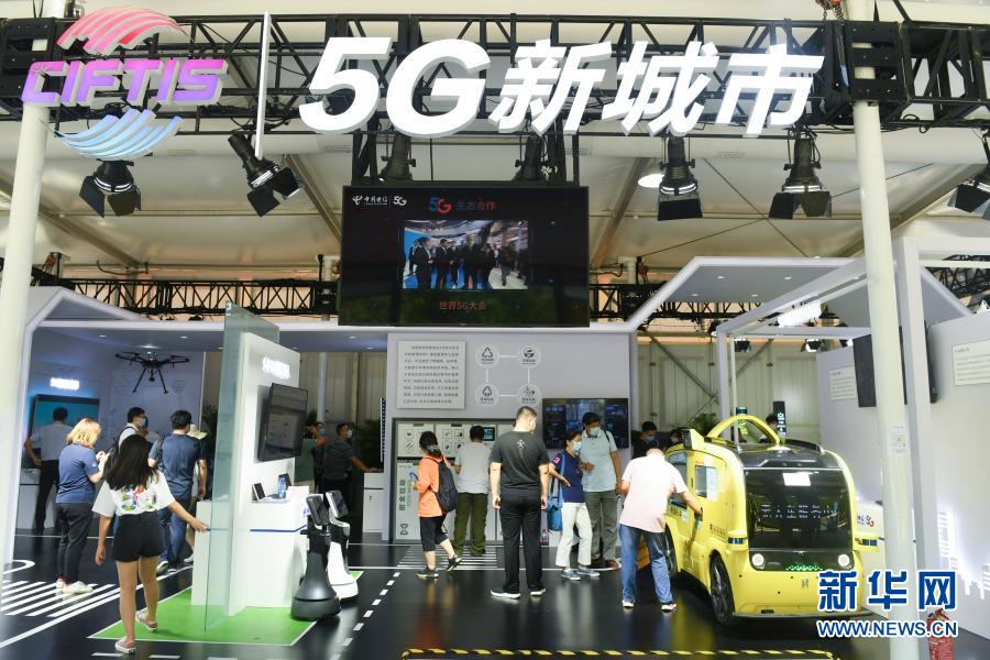 9月7日,觀眾在2020年中國國際服務貿易交易會5G通信服務專題展區參觀。2020年中國國際服務貿易交易會9月4日至9日在北京舉行。新華社記者 魯鵬 攝