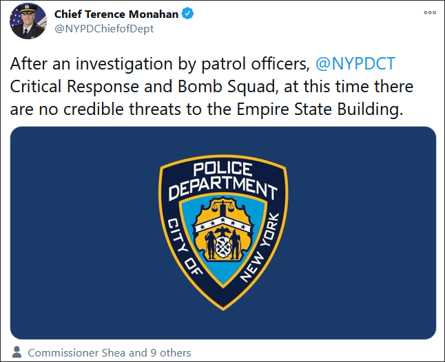 事發後不久,紐約市警察局總警監泰倫斯·莫納漢(Terence Monahan)在社交媒體上發文澄清説,“經過巡警、緊急反應小組和防爆小組的排查。目前帝國大廈沒有面臨任何可信的威脅。”