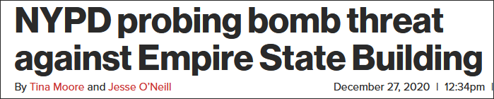 《紐約郵報》27日爆料稱,當天上午11時許,紐約市警察局(NYPD)接到一通“911”報警電話。報警人威脅説,當日中午將有一枚炸彈在帝國大廈爆炸。