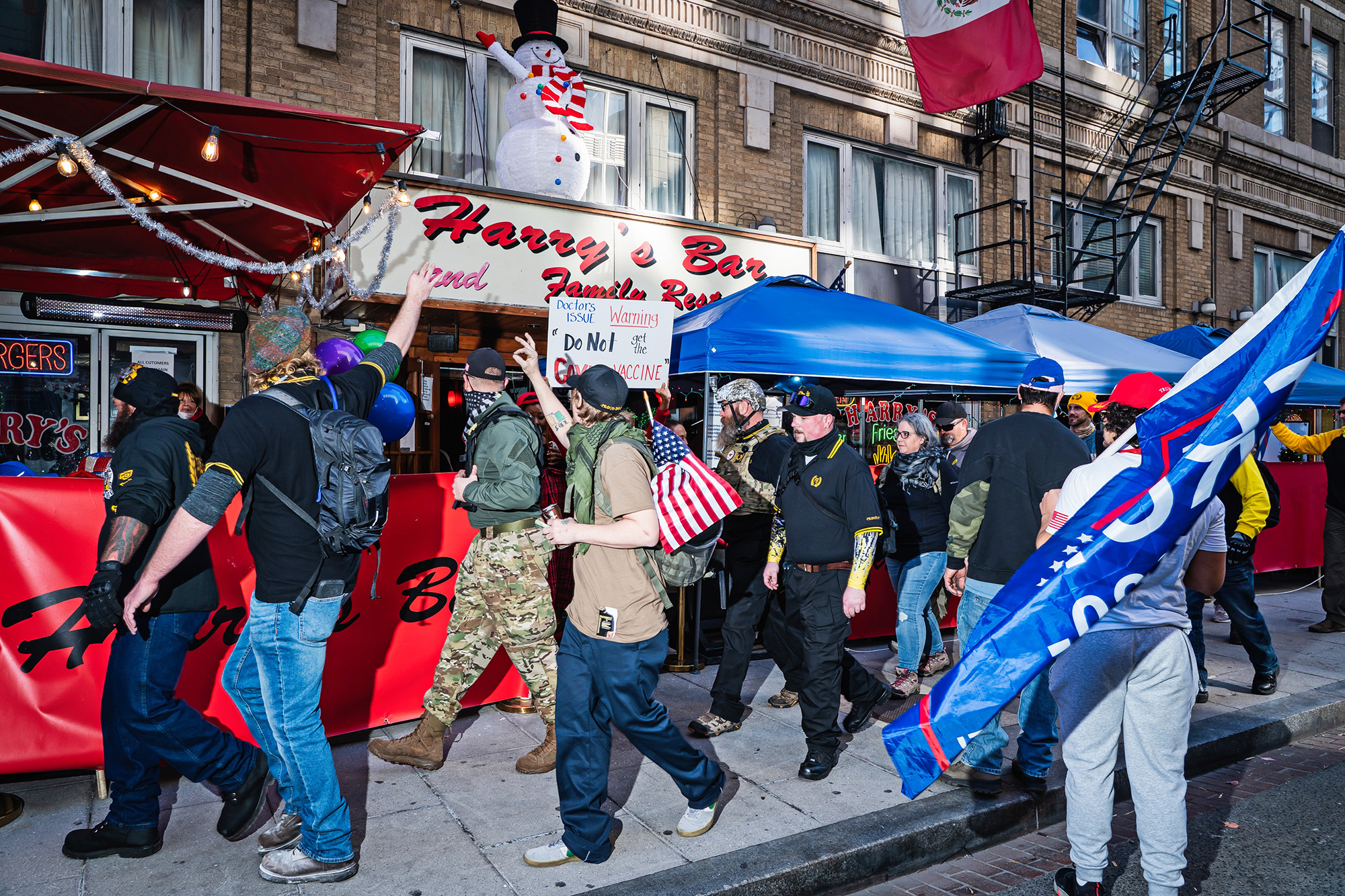 12月12日下午,數百名“驕傲男孩”聚集在哈林頓酒店門前的街道上,彷彿幫派聚會。報道形容,他們的年齡從青年到50、60歲不等,衣着凸顯標誌性的黑黃兩色,穿戴頭盔、防彈背心與護臂;許多人手持伸縮警棍、抱着啤酒箱。