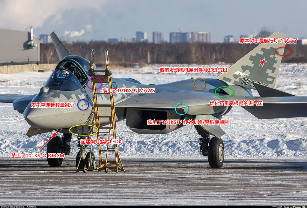 相較於原型機,這架機號為“藍色01”的量產型蘇-57配齊了101KS“環礁”系列光電傳感器,在細節方面也有所變動。