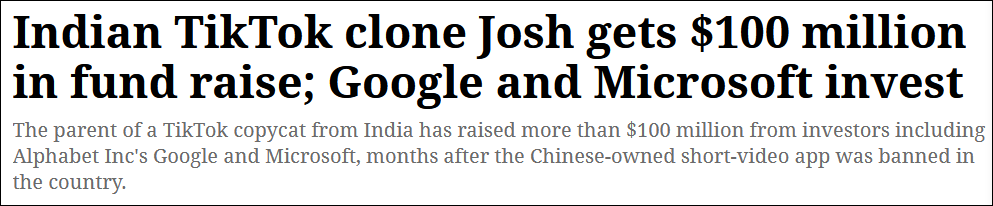據《印度快報》12月22日報道,在TikTok被禁後,印度本土短視頻應用的母公司獲得了谷歌、微軟、推特等公司的大筆投資。其中,短視頻應用Josh的母公司Verse Innovation從谷歌和微軟那裏籌集了超過1億美元的資金,公司目前估值超過10億美元。