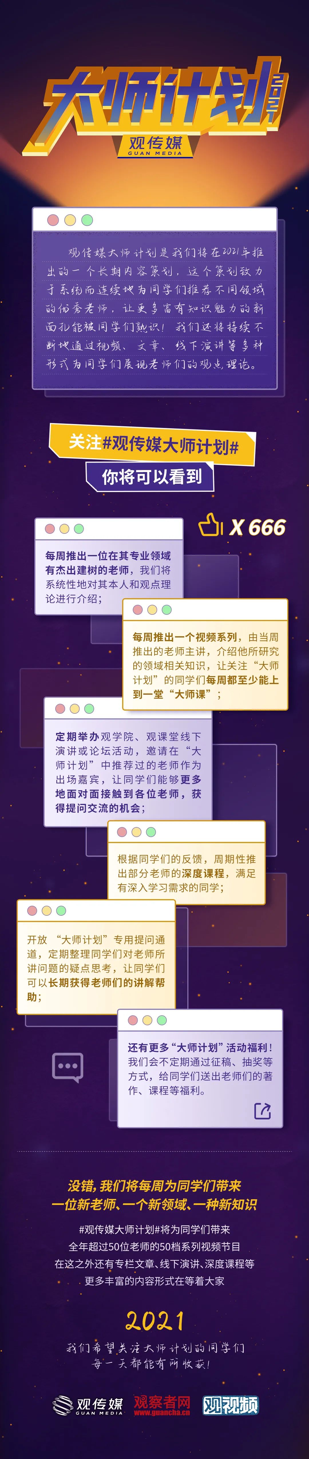 為此,我們在這裏正式宣佈,2021年將全面啓動一個旨在為同學們系統性介紹新老師新知識的策劃案: #觀傳媒大師計劃#!