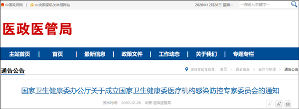 國家衞健委網站12月28日消息,日前,國家衞生健康委辦公廳發佈通知稱,國家衞健委決定組建國家衞生健康委醫療機構感染防控專家委員會。