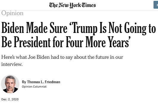 美國《紐約時報》2020年12月2日刊發了普利策獎終身評審、《世界是平的》作者托馬斯·弗裏德曼的採訪報道:《拜登已確定特朗普不可能再連任總統》