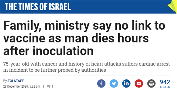 當地時間28日,以色列時報(The Times of Israel)報道稱,週一(28日)上午,一名75歲的男子在注射了第一劑輝瑞疫苗後回家不久,便失去了意識,後被宣佈死於心臟衰竭。當地衞生部門的通報表明,這名男子患有心臟病和癌症,此前曾多次心臟病發作。目前暫無證據顯示這位老人的死亡與注射疫苗有必然聯繫。