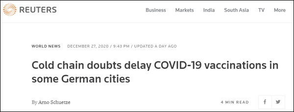 據路透社12月27日報道,德國推廣接種的輝瑞/BioNTech疫苗在運輸中因未能保證足夠低的存儲温度,而推遲疫苗接種工作。